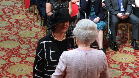 The portrait worn by Her Majesty The Queen is surrounded by a border of diamonds, designed by the Crown Jeweller, Mark Appleby. The ribbon was arranged by Royal Milliner Philip Treacy.